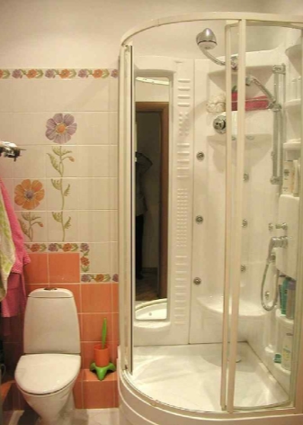 إذا كانت الغرف صغيرة ، فبدلاً من حوض الاستحمام ، قم بشراء كابينة استحمام لتوفير مساحة لغسالة الملابس. فوق حوض الغسيل في الحمام ، يمكنك تعليق مرآة كبيرة أو مرآة بأقسام لتخزين مختلف الأواني الصغيرة.