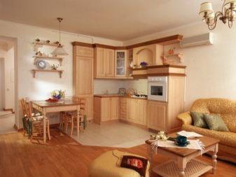 في مثل هذه الغرفة ، من المهم جدًا تقسيم منطقة الطهي والاسترخاء بشكل صحيح ، وكذلك منطقة تناول الطعام. أيضًا ، يوصي الخبراء بالاعتناء بشفاط مطبخ جيد حتى لا تنتشر روائح الطرف الثالث في جميع أنحاء الغرفة..