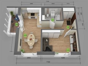 يمكنك عمل تخطيط مع منطقة مشتركة مثل الاستوديو ، عندما يتم الجمع بين المطبخ وغرفة المعيشة وغرفة الطعام في مكان واحد.