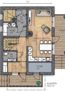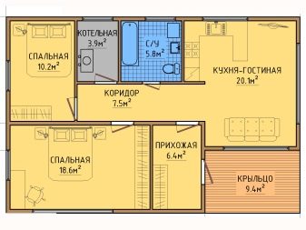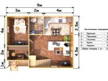 عادة ، تبلغ مساحة المسكن 7 × 9 م في نسخة من طابق واحد حوالي 60 مترًا مربعًا. م ، وفي العلية المكونة من طابقين أو المتقدمة – حوالي 120 مترًا مربعًا. م ولذلك ، فإن وضعها على مساحة صغيرة نسبيًا ليس بالأمر الصعب.