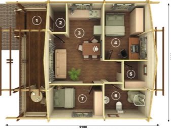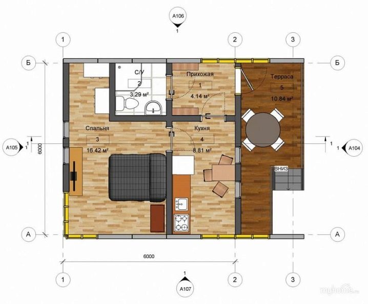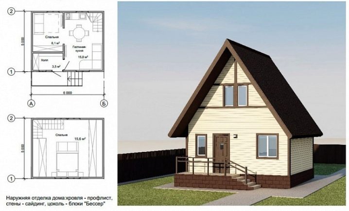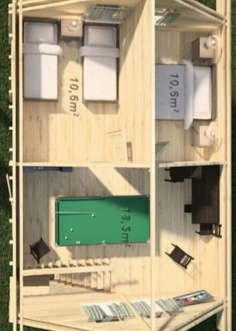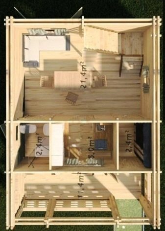 يمكن تسمية الخيار التالي بأمان كمثال لبيئة العمل والعمل الموهوب للمهندس المعماري في تخطيط مساحة المعيشة المصغرة.. يوجد شرفة ملحقة بالمنزل ، محاطة بسياج ، مما يجعله أكثر راحة وإغلاقًا. في الطابق الأرضي ، كان هناك مكان لقاعة المدخل مع خزانة ملابس وحمام ومطبخ وغرفة معيشة وتناول الطعام ودرج إلى العلية. يتم تخصيص العلية لغرفتي نوم ومكتب وصالة. يوجد بالفعل في مثل هذا المنزل مساحة أكبر من الأمتار المربعة ، ويمكن لعائلة صغيرة مكونة من 3 أشخاص العيش بشكل مريح هناك..