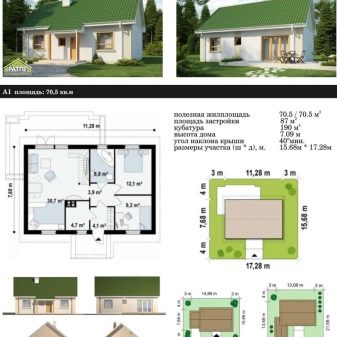 منزل علوي صغير تبلغ مساحته 70 مترًا مربعًا ، يشبه إلى حد ما خبز الزنجبيل في عيد الميلاد ، يبدو وكأنه نسخة مصغرة من منزل ريفي كلاسيكي. النموذج هو مثال ممتاز لمنزل صغير ، بينما يتناسب تمامًا مع أي منظر طبيعي. أدى طابق ونصف السكني إلى زيادة مساحة المعيشة بشكل كبير. من خلال إعطاء العلية لغرفة نوم كبيرة ، تمكن المخطط من جعل غرفة المعيشة والمطبخ وغرفة النوم في الطابق الأرضي أكثر اتساعًا. صحيح ، لم يتم التخطيط للحمام هنا ، ولكن إذا كنت ترغب في ذلك ، يمكنك إزالة بعض المربعات ، مما يؤدي إلى تقليص الغرف قليلاً. شرفة مع شرفة متصلة بالمنزل.