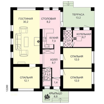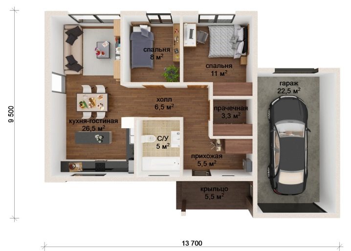 يمكن بناء منازل مثل هذه الخطة من أي مواد بناء., ولا تعتمد الجودة على الاختيار فحسب ، بل تعتمد أيضًا على سرعة البناء – يتم بناء منزل مصنوع من الخرسانة الخلوية أو منزل الإطار عدة مرات أسرع من منزل من الطوب.