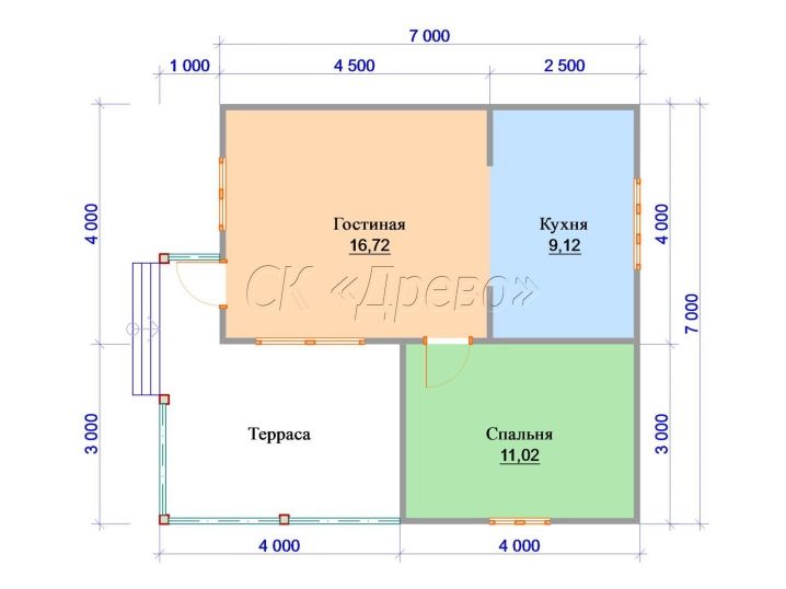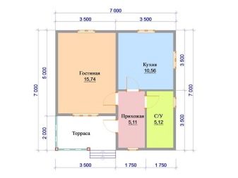 في الواقع ، تختلف المنازل ذات التراسات والشرفات قليلاً من حيث التخطيط. كل ما هو مطلوب هو استبدال المنطقة المفتوحة بامتداد صغير مغطى أثناء البناء. حتى الأساس لذلك ليس مطلوبًا في كثير من الأحيان ، وحتى بعد ذلك يتم استخدام أبسط الهياكل الداعمة.. يحتوي أحد الخيارات الممكنة لمنزل ريفي من طابق واحد على: