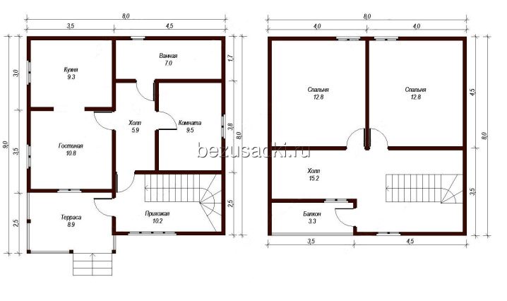 الطبقة الثانية محجوزة عادة لزوج من غرف النوم وقاعة. في الجزء السفلي ، لا يزال يتم تجهيز رواق بمساحة صغيرة نسبيًا.. يوفر حل بديل للترتيب: