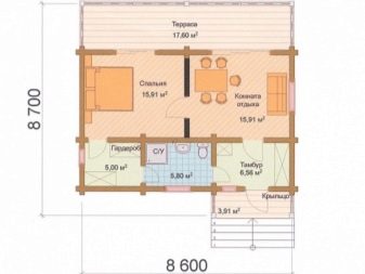 - منزل من طابق واحد مع غرفة معيشة بمساحة 19.53 متر مربع ، مطبخ – 13.48 غرفة نوم – 12.68, تراسين متقابلين كصالات – 6.04 م 2 لكل منهما مدخل. يمكن تحويل هذا التصميم بسهولة إلى استوديو ، حيث سيتم تخصيص غرفة النوم فقط بشكل منفصل. مناسبة كمنزل صيفي. الحمام والمباني الملحقة مبنية بشكل منفصل.