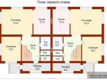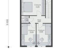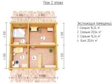 يعد التصميم التالي لمنزل خشبي من طابقين أكثر تنوعًا من المخطط أعلاه.. يحتوي هذا التصميم أيضًا على مدخلين. يؤدي أحدهم إلى الدهليز ثم إلى الصالة المركزية. يوجد في نفس الجزء من المنزل غرفة مرجل يمكن الوصول إليها من الردهة. بشكل عام يمكن تقسيم المنزل إلى 3 أقسام متصلة بواسطة صالة. الحجرة الأولى عبارة عن غرفة نوم وحمام مجاور. الحجرة الثانية عبارة عن غرفة معيشة واسعة ، والثالثة عبارة عن مطبخ وغرفة استحمام. علاوة على ذلك ، المطبخ نفسه كبير نوعًا ما وله إمكانية الوصول إلى شرفة كبيرة..