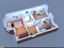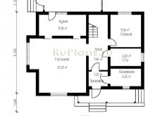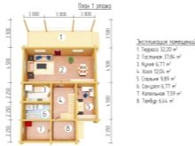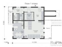 يوجد بالقرب من المدخل مباشرة من الشرفة دهليز صغير ، وبعد ذلك تبدأ قاعة معينة ، يمكنك من خلالها الوصول إلى الحمام بغرفة المرجل ، إذا ذهبت إلى اليسار ، والمطبخ مع غرفة المعيشة وغيرها غرف ، إذا ذهبت مباشرة. سيكون حجم هذا المنزل أكثر بقليل من 9 في 12 ، أي 9.2 في 12.2.