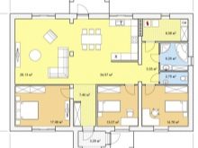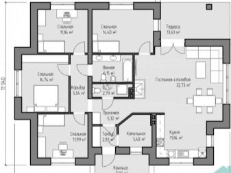لذلك ، دعونا ننظر أولاً إلى مشاريع الهياكل المكونة من طابق واحد على أنها أبسط وأكثر اقتصادا. سيشمل أحد هذه المخططات قبوًا واسعًا وتراسًا جميلًا.. في الخارج ، سيبدو هذا المبنى وكأنه منزل مربع عادي ، ولكن مع إضافة التراس نفسه. إذا كنت تعمل على التصميم ، فسيكون مظهر هذا المنزل جيدًا جدًا. يوجد بداخل هذا المسكن 4 غرف معيشة ، منها 3 غرف نوم.