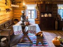 - أسلوب الكوخ الروسي. بالطبع ، أول ما يتبادر إلى الذهن هو إنشاء منزل يتذكره الكثير من الناس منذ الطفولة. للقيام بذلك ، سيتعين عليك التخلي عن النوافذ البلاستيكية – فقط الخشب أو تقليده عالي الجودة. من الأفضل ترك الجدران في شكلها الأصلي ، بعد معالجتها بورنيش خاص مقاوم للرطوبة. لمزيد من التأثير ، يمكنك وضع عناصر داخلية مختلفة: الصناديق والمقاعد. وسيكون الفرن هو الأبرز – وإن لم يكن يعمل ، لكنه يناسب تمامًا كل شيء آخر.