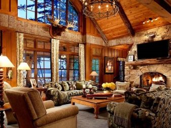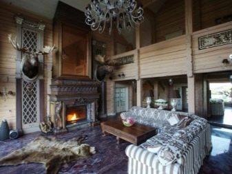- نمط نزل الصيد. سيبدو هذا التصميم جيدًا جدًا في المباني المكونة من طابق واحد. لخلق مثل هذا الجو ، هناك حاجة إلى سمات صيد مختلفة ، وهي: الأبواق ، والجلود ، والجوائز. السجاد والبسط والبطانيات على شكل جلود الحيوانات ستبدو رائعة. من المهم أيضًا وضع مدفأة – لن تبدو جيدة فحسب ، بل يمكن أن تعمل أيضًا..