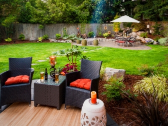 لكن لا تنسى الراحة. للاستمتاع بالمساحات الخضراء كانت أكثر راحة ، تحتاج إلى تجهيز مكان للاسترخاء. كل هذا يتوقف بالتساوي على حجم عائلتك والمساحة التي تشغلها الفناء. يمكنك الاستعانة بكراسي من الخيزران أو مقعد ، أو يمكنك بناء شرفة مراقبة فاخرة مصنوعة من الخشب الطبيعي.