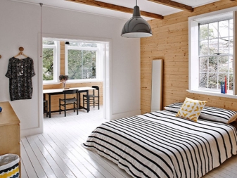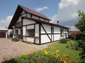 إذا لم يكن الجزء الخارجي من الغرفة مؤطرًا بسجل أو لوح خشبي ، إذن الجدران مطلية بطلاء أبيض أو مغطاة بطبقة من الجص. بعد ذلك ، تصبح المنازل ذات الإطار البسيط أكثر جمالًا وأناقة. في هذه الحالة ، غالبًا ما يتم استكمال الجدران الفاتحة بأساس من الطوب الداكن وأسقف داكنة..