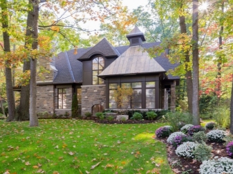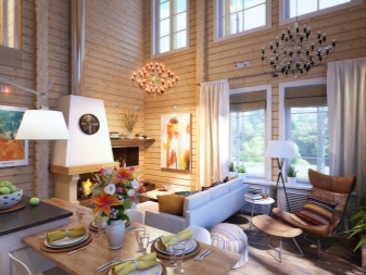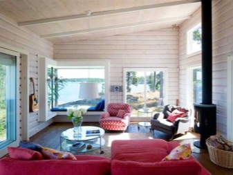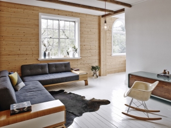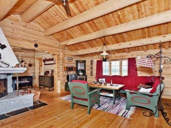 بشكل عام ، في النمط الاسكندنافي ، يتم إيلاء الكثير من الاهتمام للخشب. لا يتم استخدامه فقط في البناء. في الكابينة الخشبية المنخفضة ، غالبًا ما يكون الأثاث مصنوعًا من نفس المادة. وفي الخارج ، تم تزيين المبنى بسلالم خشبية وألواح خشبية وحتى أسقف..