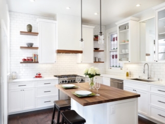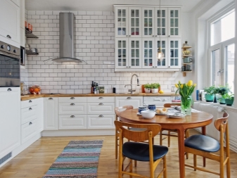المثال الأخير هو المطبخ المثالي على الطراز الاسكندنافي الكلاسيكي. كل شيء هنا ، باستثناء سطح الطاولة والكراسي والأرضية ، مصنوع بألوان فاتحة – جدران من الطوب الأبيض ومجموعة الإضاءة وحتى الأواني الفخارية. على الرغم من أن الغرفة صغيرة جدًا ، إلا أن المصممين تمكنوا من استيعاب كل ما تحتاجه فيها. كل من الأرفف المفتوحة والخزائن المغلقة معلقة على الجدران. يتم إخفاء كل ما هو مطلوب للطهي في الأرفف المغلقة ، ويتم تزيين الأرفف بأشياء صغيرة لطيفة مختلفة: الأطباق والجرار والزهور.