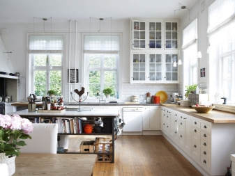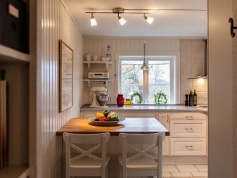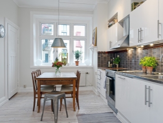 المثال الأخير هو المطبخ المثالي على الطراز الاسكندنافي الكلاسيكي. كل شيء هنا ، باستثناء سطح الطاولة والكراسي والأرضية ، مصنوع بألوان فاتحة – جدران من الطوب الأبيض ومجموعة الإضاءة وحتى الأواني الفخارية. على الرغم من أن الغرفة صغيرة جدًا ، إلا أن المصممين تمكنوا من استيعاب كل ما تحتاجه فيها. كل من الأرفف المفتوحة والخزائن المغلقة معلقة على الجدران. يتم إخفاء كل ما هو مطلوب للطهي في الأرفف المغلقة ، ويتم تزيين الأرفف بأشياء صغيرة لطيفة مختلفة: الأطباق والجرار والزهور.