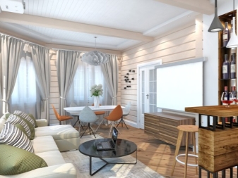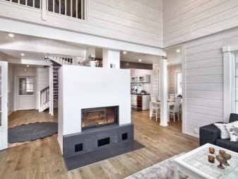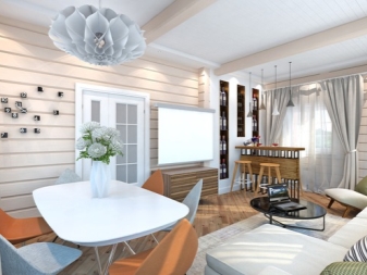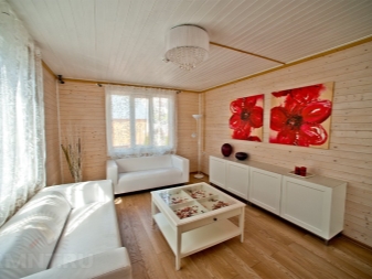 إذا لم يكن الجزء الخارجي من الغرفة مؤطرًا بسجل أو لوح خشبي ، إذن الجدران مطلية بطلاء أبيض أو مغطاة بطبقة من الجص. بعد ذلك ، تصبح المنازل ذات الإطار البسيط أكثر جمالًا وأناقة. في هذه الحالة ، غالبًا ما يتم استكمال الجدران الفاتحة بأساس من الطوب الداكن وأسقف داكنة..