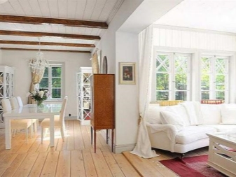 في منزل بسيط خفيف ، يبدو الأثاث ذو الطراز البيئي أو العتيق أو الكلاسيكي أو الباروكي مناسبًا أيضًا. لكن لا ينبغي أن يكون هناك الكثير من التفاصيل خارج الفكرة العامة. على سبيل المثال ، في غرفة المعيشة ، بالإضافة إلى الأثاث البسيط والأنيق ، يمكنك وضع خزانة ذات أدراج قديمة بأرجل قوية مزورة أو كرسي بذراعين قديم منجد بالجلد. مثل هذه التفاصيل ستحول الغرفة إلى مكان مريح حقًا للاسترخاء ، وليس صورة من مجلة لامعة..