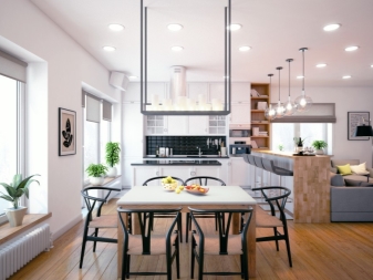 تتناسب التكنولوجيا الحديثة أيضًا بشكل عضوي مع الداخل: الموقد وغسالة الصحون والأشياء الأخرى التي تجعل حياة ربات البيوت الحديثة أسهل بكثير. تبدو المصابيح المعلقة على الحوامل الداكنة رائعة أيضًا هنا..