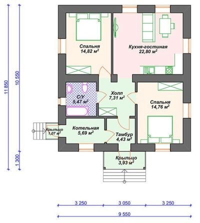 غالبًا ما يكون الخيار الاقتصادي لمثل هذه المشاريع هو منزل من طابق واحد ، ويمكن أن تكون مساحته مختلفة ، ولكن الخيارات الأكثر شيوعًا تتراوح من 60 إلى 120 مترًا مربعًا. م.