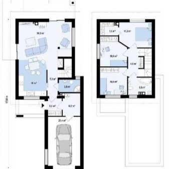 خيار جيد لمنزل يبدو مضغوطًا ، بينما يحتوي على جميع المباني اللازمة. الطابق الأول ذو مخطط مفتوح. مساحة كبيرة جدًا مقسمة إلى مناطق. يضم الجناح المنفصل منطقة الطهي ، بينما يضم القسم الآخر منطقة لتناول الطعام والجلوس. في مثل هذه الغرفة ، من الملائم جدًا لجميع أفراد الأسرة التجمع واستقبال الضيوف. يوجد في الطابق الثاني ثلاث غرف ، قد تكون إحداها غرفة نوم الوالدين والأخرى مخصصة للأطفال. يوجد حمام في الطابقين الأول والثاني. في هذه الحالة ، في الحالة الأولى ، يمكنك تثبيت ، على سبيل المثال ، كابينة دش ، وفي الثانية يمكنك وضع حمام واسع ، أو العكس..