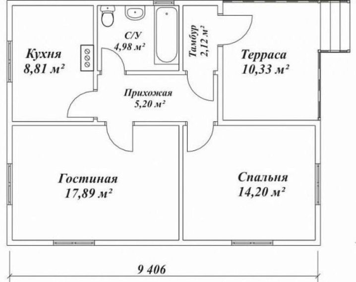 - في هذه الحالة ، يحتوي المنزل على غرفة معيشة – مطبخ ، يوجد على جانبيها غرفتا نوم. هناك أيضا غرفة المرجل وحمام. تتحد جميع الغرف بواسطة قاعة. يمكن الدخول إلى المنزل من جوانب مختلفة ، لذلك يوجد شرفتان.