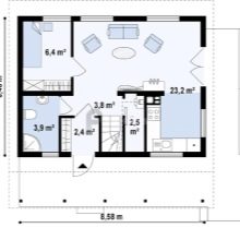 لكن هذه مشاريع جاهزة. يمكن للمالك نفسه ، حتى في مرحلة التصميم ، التخلص من المساحة الداخلية وفقًا لتقديره الخاص.. على سبيل المثال ، قد توجد مساحة مشتركة واحدة في الطابق الأول ، مقسمة إلى مناطق: