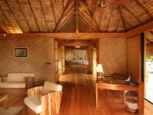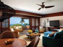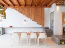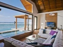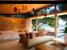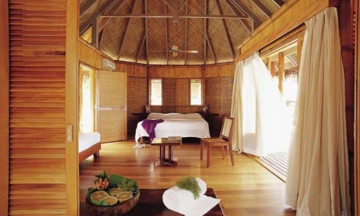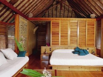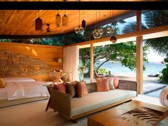 في مثل هذا المنزل ، ستشعر براحة تامة ويمكنك أن تستريح جيدًا.. يمكن أن يكون الأثاث من الخيزران أو من أنواع مختلفة من الخشب. يجب ألا يحمل الطابق الثاني حمولة وظيفية. تهيمن ألوان الباستيل على الداخل ، على سبيل المثال ، الرمال أو البني الفاتح أو البيج أو الأبيض ، والتي يمكن تخفيفها بعناصر من الأسود أو الأحمر أو ألوان أخرى. غالبًا ما يستخدم المصممون الأقمشة للزينة ، ولترتيب المدخل والمطبخ ، يمكنك اختيار أعمال البناء بالطوب.