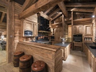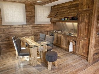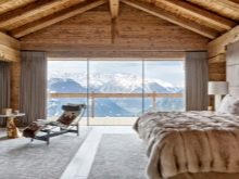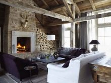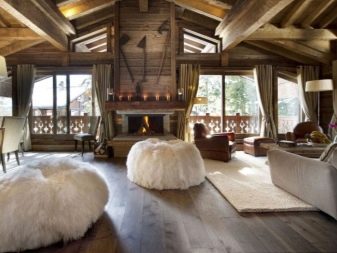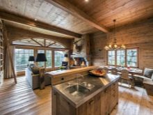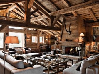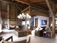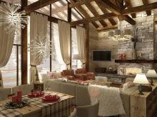 - يمكن دمج الغرف المشتركة في مكان واحد. يتعلق الأمر في المقام الأول بالمطبخ وغرفة الطعام وغرفة المعيشة. ويتوافق هذا المزيج قدر الإمكان مع أسلوب الشاليه ذاته – تحصل على مساحة كبيرة مع مناطق مخصصة. هنا يمكنك السماح بمدفأة وأثاث ضخم ، وبالطبع عوارض السقف.