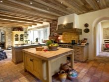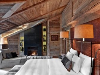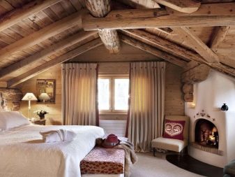 - يتميز السقف المصمم على طراز الشاليه بعوارض خشبية. إذا كانت الغرفة منخفضة ، فإن السطح الأبيض المسطح يكفي ، ومع ذلك ، فإن الحزم ، إذا كنت تريد حقًا ، مناسبة في غرفة منخفضة ، فقط لا تحتاج إلى جعلها ضخمة. الخيار الأفضل هو عوارض السقف الداكنة (خشنة بشكل متعمد وغير متجانسة من حيث اللون) وألواح خشبية فاتحة كخلفية.