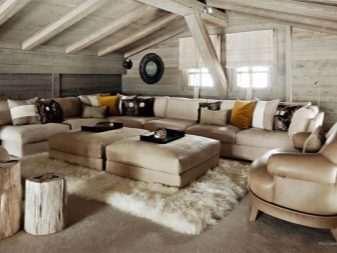 - كراسي بذراعين وأريكة منجدة بقماش طبيعي أو جلد, الزخرفة بالمنحوتات الخشبية ممكنة عند الاقتضاء. العناصر المزورة لها مكان أيضًا في منزل الشاليه.