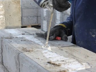 - عند إقامة هياكل الجدار ، وضع الكتل أجريت على محلول لاصق خاص. يجب أن يكون سمك التماس 2-5 مم.