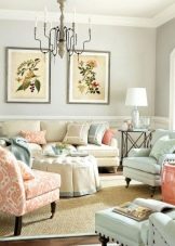 من خلال هذه الغرفة يتم الحكم على المرء أولاً وقبل كل شيء بشأن الوضع في شقة أو منزل ريفي. عادة ، يوفر هذا التنسيق إضاءة طبيعية نشطة للغاية. يجب أن تكون المفروشات رومانسية وجيدة التهوية من الخارج. الأساليب الأخرى هي نفسها الموجودة في باقي الغرف..