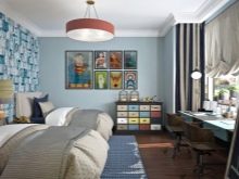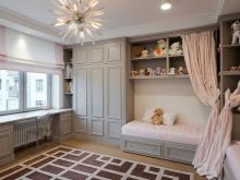 من المفترض أن تكون هذه الغرفة مضاءة بشكل أساسي بالضوء الطبيعي. ستائر أنيقة ، ولكنها ليست طنانة للغاية ، معلقة على النوافذ. غالبًا ما يساعد الاختيار الصحيح للظلال في التغلب على الظلام المفرط. يتم تحويل عتبات النوافذ إلى أرائك ، على الرغم من أنها يمكن أن تكون أيضًا مكانًا جيدًا للعمل للأطفال في سن المدرسة..