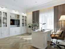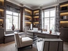 في هذه الغرفة ، يمكن التركيز بشكل رئيسي على استخدام الخشب الطبيعي. الأثاث الداكن النبيل واللوحات الزخرفية المتشابهة في اللون ستعزز الانطباع بشكل كبير. الشيء الرئيسي هو أنه لا يزال يتم توفير ضوء طبيعي كافٍ.. تم تزيين الأسقف بعوارض خشبية ملونة. الخفايا الأخرى: