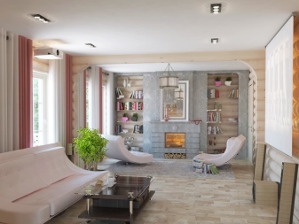 الغرفة المختارة صغيرة جدًا. لجعلها تبدو أكثر اتساعًا ، يتم استخدام الألوان الفاتحة عند تزيين الجدران والأرضيات والسقف وعند اختيار الستائر والأثاث والسجاد. كل هذه التفاصيل مرتبة جدًا وخفيفة ولا تجذب الانتباه إلى نفسها. على عكس هذه القاعدة ، فإن الجدار المغطى بألواح خشبية والمدفأة الجميلة تبدو جميلة وتجذب الانتباه على الفور..