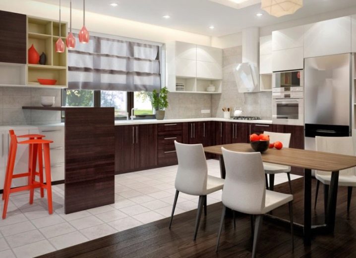 بالإضافة إلى الخزانات الرئيسية ، في المطبخ ، يمكنك أيضًا وضع طاولة بار مريحة مع كراسي عالية مشرقة. ستجعل المقصورة الداخلية أكثر تشويقًا وإشراقًا وستكون مكانًا ممتازًا لتناول فنجان من القهوة الساخنة في الصباح..