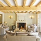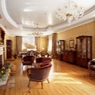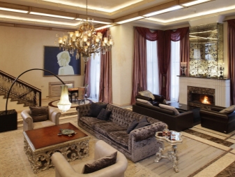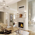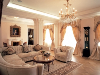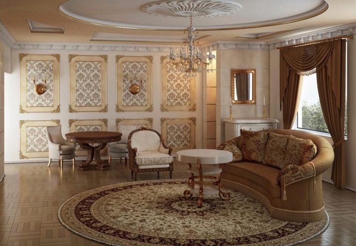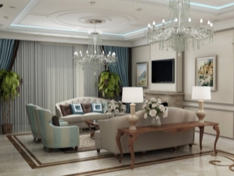 المثال الأخير هو غرفة جلوس فاخرة مزينة بأسلوب كلاسيكي. يتم التحقق من كل عنصر واختياره وفقًا لجميع القواعد. قاعدة خشبية فاتحة ، سقف غير عادي مع قوالب من الجص عند الحواف وفي الوسط ، تخلق خلفية مثالية للأثاث الجميل الذي يبدو أنه ينتمي حقًا إلى عصور ماضية..