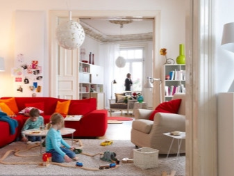 ستحب العائلات التي لديها أطفال فكرة مساحة اللعب الصغيرة في غرفة المعيشة. لذلك لن تصطدم بالألعاب المتناثرة في كل مكان ، وسوف يقضي الصغار وقتًا تحت سيطرتك. في غرفة المعيشة ، يكفي استبدال كرسي بذراعين أو أريكة بسجادة لعب مشرقة وسلة من الألعاب.. لا تحتاج حتى إلى شراء أي أقسام إضافية ، خاصة إذا كان الأطفال كبارًا بالفعل.