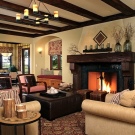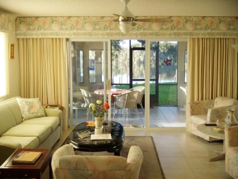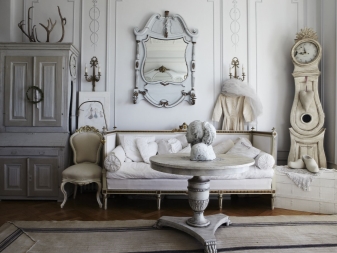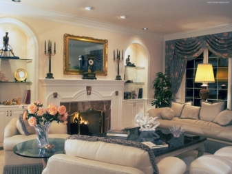 أريكة ناعمة جميلة وطاولة محاطة بكراسي ذات ألوان فاتحة وكرسي صغير بذراعين يتناسب تمامًا مع الداخل ، بالإضافة إلى مرآة في إطار مذهّب. حتى الستائر تبرز ملامح التصميم الداخلي الكلاسيكي. تجعل الستائر الثقيلة ذات الظلال الدافئة من اللون البني الغرفة أكثر راحة ، لكنها لا تنتهك الفكرة العامة..