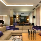 تم تنشيط المناطق الداخلية من خلال نباتات حية جميلة وأرائك أرجوانية مع وسائد أرجوانية تبرز على هذه الخلفية الفاتحة..