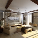 لهذا السبب ، غالبًا ما تكون المنطقة للاسترخاء ، فهي مجهزة إما في وسط الغرفة أو تحت جدار مجاني. إذا كان الدرج يشغل مساحة كبيرة ، فيمكن وضع الأريكة والكراسي بذراعين بجانبه..