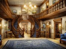 لبناء كوخ على طراز القصر ، يفضل استخدام المواد الطبيعية. يمكنك بناء منزل من الطوب أو الحجر حسب ميزانيتك. من الداخل ، يمكن ترك الجدران عارية ، تبدو رائعة للغاية. إذا رغبت في ذلك ، يمكن تنجيد الجدران الحجرية بألواح خشبية أو تغطيتها بالجص. كخيار للميزانية ، فإن ورق الحائط المصمم كمواد أكثر تكلفة مناسب: الطوب أو البناء أو الرخام.