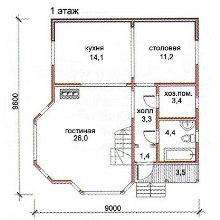 منزل خشبي من طابق واحد بمساحة إجمالية 95 مترًا مربعًا. م ، يحتوي على نوافذ كبيرة. يؤدي مدخل الردهة من الشرفة ، وهناك شرفة أرضية زجاجية. من خلال الدهليز ، يمكنك الدخول إلى القاعة ، حيث يمكنك الوصول إلى جميع أماكن المعيشة والمباني التقنية – مطبخ – غرفة معيشة ، غرفتي نوم ، حمام.