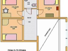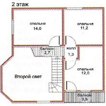 كوخ من طابقين (108 م 2) مصنوع من الخشب مع ضوء ثان ، له نافذة كبيرة. في الطابق السفلي ، في مساحة واحدة مع عناصر تقسيم ، يوجد مطبخ وغرفة طعام وغرفة معيشة وحمام وغرفة تقنية تقع بشكل منفصل. يوجد في الطابق الثاني 3 غرف نوم يمكن الوصول إليها عن طريق درج يؤدي إلى غرفة المعيشة. يحتوي المنزل على شرفة وشرفة.