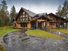 منزل خشبي فاخر كبير. عناصر السقف المنحدر والزجاج الواسع النطاق للجزء المركزي ودعم مصنوع من الحجر البري تجعل الهيكل غير عادي.