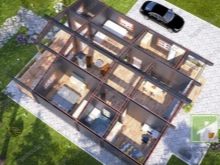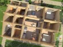 - منزل صغير 42.3 متر مربع. من المفترض أن تعمل الألواح الشمسية هناك أيضًا. المنزل عبارة عن إطار ، منتهي بالجوانب ، ويمثل غطاء السقف بالبلاط المعدني والفولاذ المجلفن. يحتوي المنزل أيضًا على 3 غرف ، يمكن أن تصبح إحداها مطبخًا (إذا لم يكن مبنى للضيوف). بين الغرف – حمام وصالة.