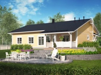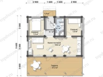 - بيت 65.5 مربعات, والتي يمكن أن تكون إقامة دائمة وضيف. لا توجد أرضية علوية أيضًا ، وتبلغ مساحة المعيشة 40 مترًا مربعًا. يوجد أيضًا تراس ونوافذ ليس فقط في غرفة المعيشة ، ولكن أيضًا تطل غرف النوم عليها. هناك غرفتا نوم في المنزل. يمكن دمج غرفة المعيشة مع المطبخ ، ولكن إذا كان المنزل للضيوف ، فإن المطبخ ليس ضروريًا على هذا النحو. يمكن أيضًا ترتيب الشرفة بشكل جيد لموسم الصيف – من منطقة تناول الطعام إلى الشواء أو مجرد الاسترخاء البطيء في الأراجيح..