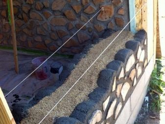 يتم تطبيق الحل مباشرة على أساس المبنى ، وبعد ذلك يبدأ وضع الأوتاد عبر الجدران ، باتباع نمط كومة الخشب. لا ينبغي أن تكون الفجوة بينهما كبيرة جدًا ، لذلك يجب أيضًا سدها بحل. يجب أن تكون هذه الطبقة أعلى قطع الخشب مباشرة ، وبعد ذلك يتم وضع الجزء التالي من الفراغات. يتكرر تسلسل الإجراءات حتى الوصول إلى الارتفاع المطلوب. من الأفضل عمل تقوية أفقية كل 3-4 صفوف..
