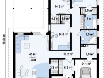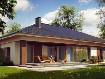 تعتبر خطط الكوخ بارتفاع طابق واحد جذابة للغاية لمعظم المطورين. ومع ذلك ، يتم استكمال أحد هذه الخيارات ، خلافًا للعرف ، بمرآب. صحيح ، في ظروف روسيا ، هذه الإضافة مناسبة تمامًا ، نظرًا للمسافات المتزايدة وعدم القدرة على الاستغناء عن السيارة. الواجهة مشطبة بالجبس الخفيف والخشب. تم تقديم المرآب بمهارة باستخدام نفس تصميم المبنى الرئيسي..